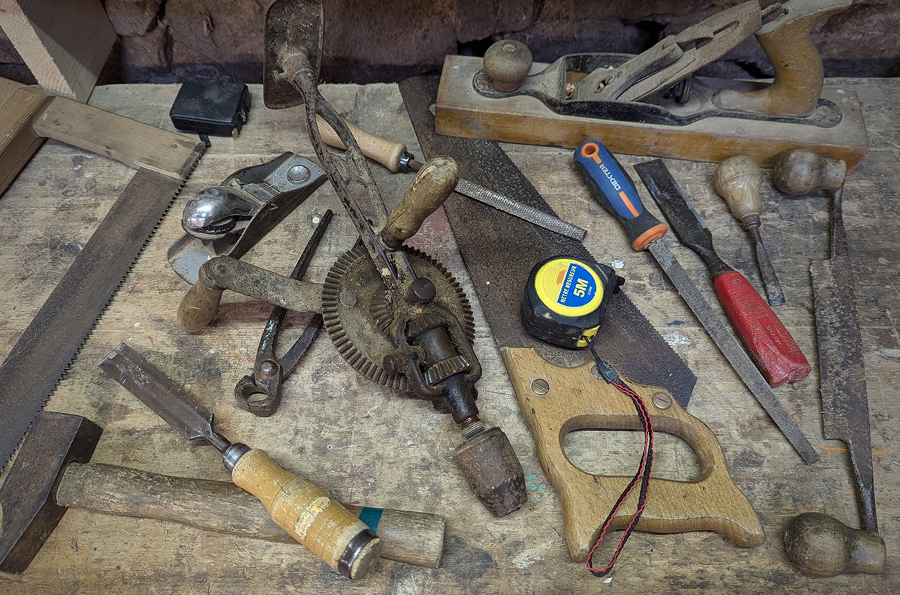 Splitting Maul • Large Axe • Small Axe • Bench Chisel • Drawknife • Block Plane • Beveled Edge Chisel • Bench Plane • Eggbeater Drill • Frame Saw • Half Round Rough & Smooth Files • Hammers • Hand Saw Long & Short • Precision Mitre Saw • Pruning Saw • Sandpapers • Gauge Chisel • Tape Measures • Triangular File • Wooden Mallet • Wooden Vice
